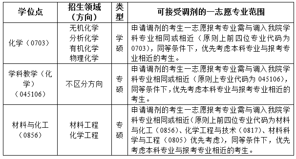 根据我院2026年硕士研究生招生计划、一志愿考生录取情况,我院化学、学科教学(化学)、材料与化工3个专业可接收调剂考生,现将有关事宜通知如下:
