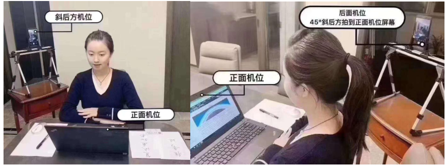 (7)主设备放置在考生座位正前方,音频视频必须全程开启。考生全程正面免冠朝向摄像头,保持注视主机摄像头,视线不得离开。保证头肩部及双手出现在视频画面正中间。不得佩戴口罩,保证面部清晰可见,头发不可遮挡耳朵,不得戴耳饰、耳机。另一台辅助设备放于考生右后方45度位置,确保监控范围覆盖第一台设备的显示屏幕和考生本人头部、背部、手部。考生须根据考务人员远程要求,及时进行视频角度及清晰度调整。两台设备须全部打开视频功能,但侧后方辅助设备要关闭音频功能(包括外放和麦克风),避免窜音影响复试。后台关闭除在线复试系统以外的其他软件程序和通讯功能(含浏览器非系统界面、QQ、微信、手机短信功能等)。