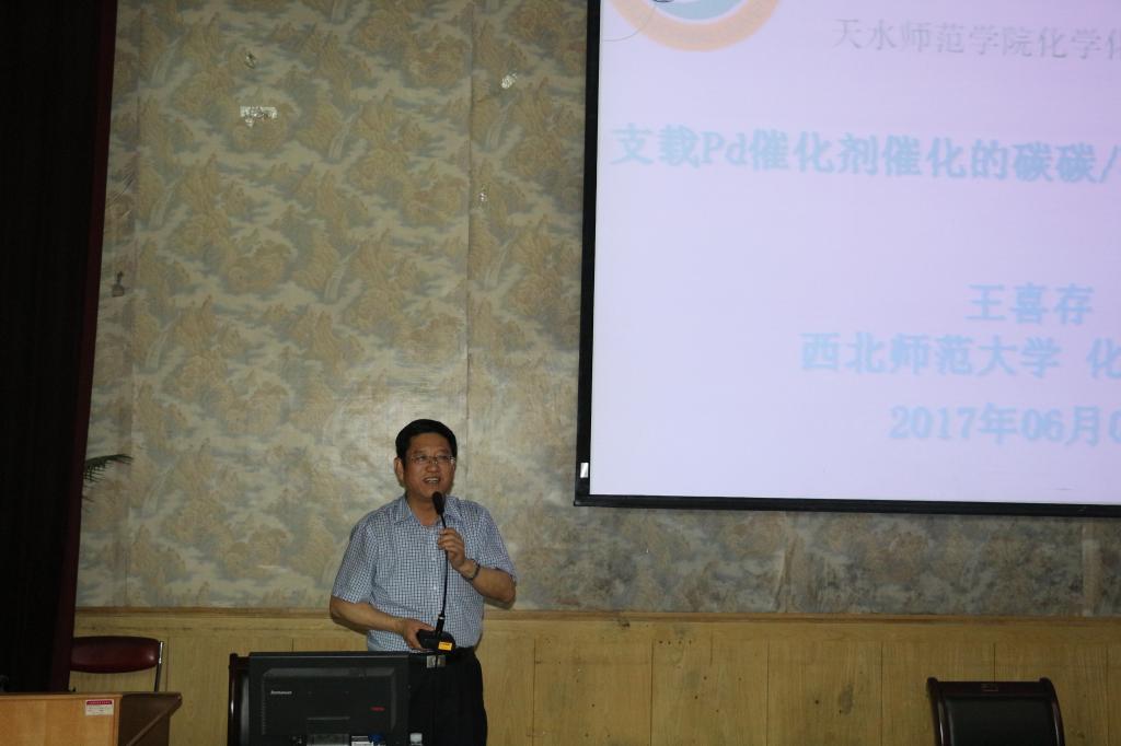 6月1日晚,在1号报告厅,西北师范大学博士生导师王喜存教授,为我院师生做了题为“关于支载Pd催化剂催化的碳碳/碳杂偶联反应研究”的学术报告,报告会由我院副院长吕玲玲博士主持,研究生处左国防处长、化工学院党总支书记王小芳、院长刘新文,副书记雷新有、副院长杨富巍、吕玲玲及部分教师及学生大约200余人聆听了报告。