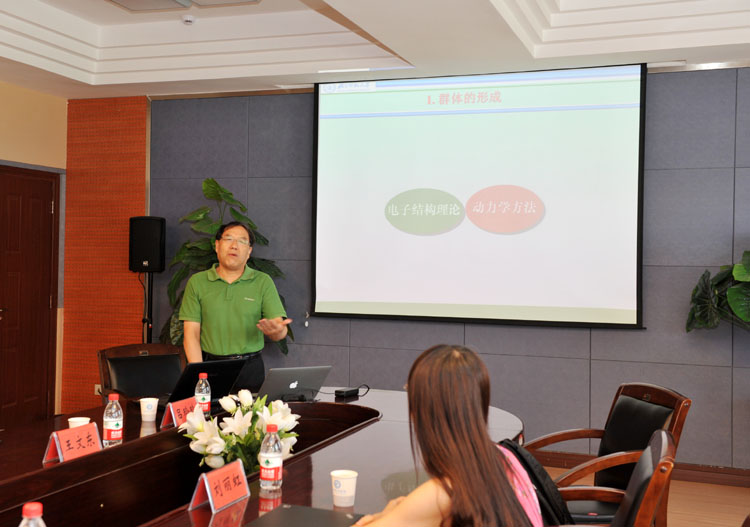 在学术交流会上,方维海院士以《理论与计算光化学群体》为题,从计算化学“电子结构理论”和“动力学方法”两个方面展开,就自己及团队的“建立量子耗散随机场理论与级联方程方法”、“Pt配合物的发光性质”以及“萤火虫发光过程理论与计算模拟”等诸多研究成果做了详细讲述。北京师范大学刘丽虹博士以《Ab InitioMulti Spawning Method and its applications》为题,详细介绍了Spawning Method的研发及其应用。我院副院长吕玲玲博士以《多自旋态催化反应的自旋磁效应及非绝热动力学研究》为题,从“实验方向”、“理论方向”“研究方案及措施”等方面;李志锋博士以《过渡金属亲金属键及其光学性能研究》为题,从“过渡金属亲金属键及其光学特性构效研究”和“过渡金属催化C(SP3)氢键构建C-C键研究”两个方面;李会学博士以《有机半导体分子间及分子内电荷转移的理论研究》为题,从“理论模型”、“磷光光谱的理论研究”等方面;袁焜博士以《阴离子识别及纳米尺度上客体化学》为题,从“小分子、超分子基元间弱键结构与性质”、“设计创造工具分子和超分子基元新体系”等方面,分别就自己的研究方向和研究成果向方院士做了汇报。方院士就我院理论与计算化学学科团队的研究方向、研究进展等进行了交流指导。