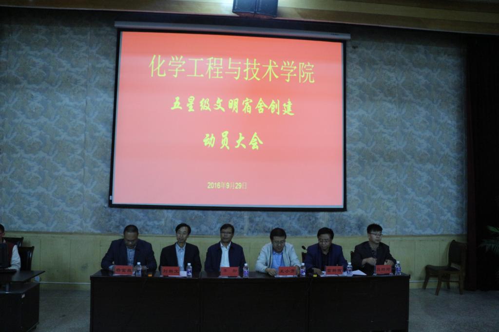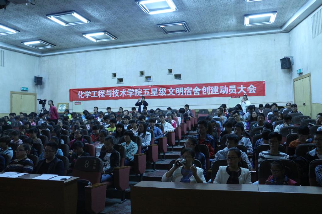 9月29日下午我院在一号报告厅隆重举行了五星级文明宿舍创建动员大会。学生工作处处长李勃、化工学院书记王小芳、院长刘新文、副书记雷新有、副院长杨富魏和吕玲玲,辅导员、各班主任及各班班长,学生会成员参加了本次大会。会议由副院长杨富巍主持。