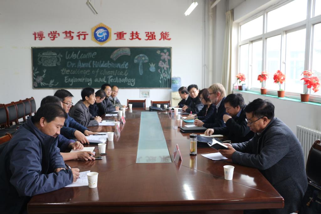 11月14日上午,化工学院党政领导班子及部分教师在化工学院会议室(3号实验楼211)举行座谈会欢迎德国专家Dr. Hildebrandt axel教授来我院指导学科及专业建设等工作。刘新文院长首先代表化工学院对Dr. Hildebrandtaxel来校指导我院学科、专业及实验室等建设工作表示热烈的欢迎和衷心的感谢,之后刘院长介绍了学校的历史沿革、办学规模、学科研究、专业建设、人才培养等情况,希望德国专家此行能为我院的专业、学科建设、课程设置、师资队伍及人才培养等方面给予指导,进一步推动我院向应用技术型转型与发展。