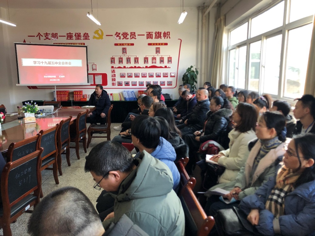 为进一步深入学习贯彻党的十九届五中全会精神,12月24日太阳成集团tyc7111cc主页全体教职工及学生党员在三号实验楼211会议室召开会议,集中学习党的十九届五中全会精神,学校党委常委,副校长王旭林与全体师生分享了学习十九届五中全会体会。