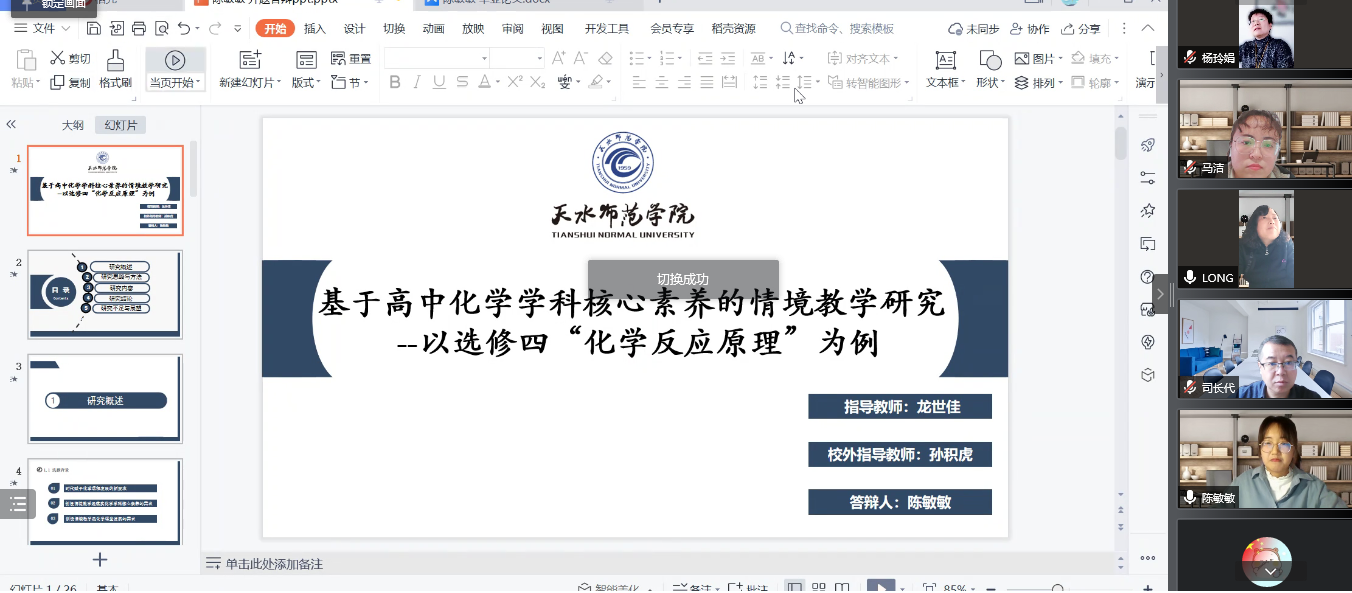 根据研究生处工作安排及近期疫情防控工作的要求,为保障2022届教育硕士研究生学位论文的高质量完成,太阳成集团tyc7111cc主页通过认真制定线上教育硕士学位论文预答辩工作方案,周密安排整个答辩流程,于3月28日在腾讯会议平台举行了2022届学科教学(化学)教育硕士研究生学位论文预答辩。此次线上预答辩共有13位教育硕士研究生参加,2021级全体研究生在线旁听观摩。