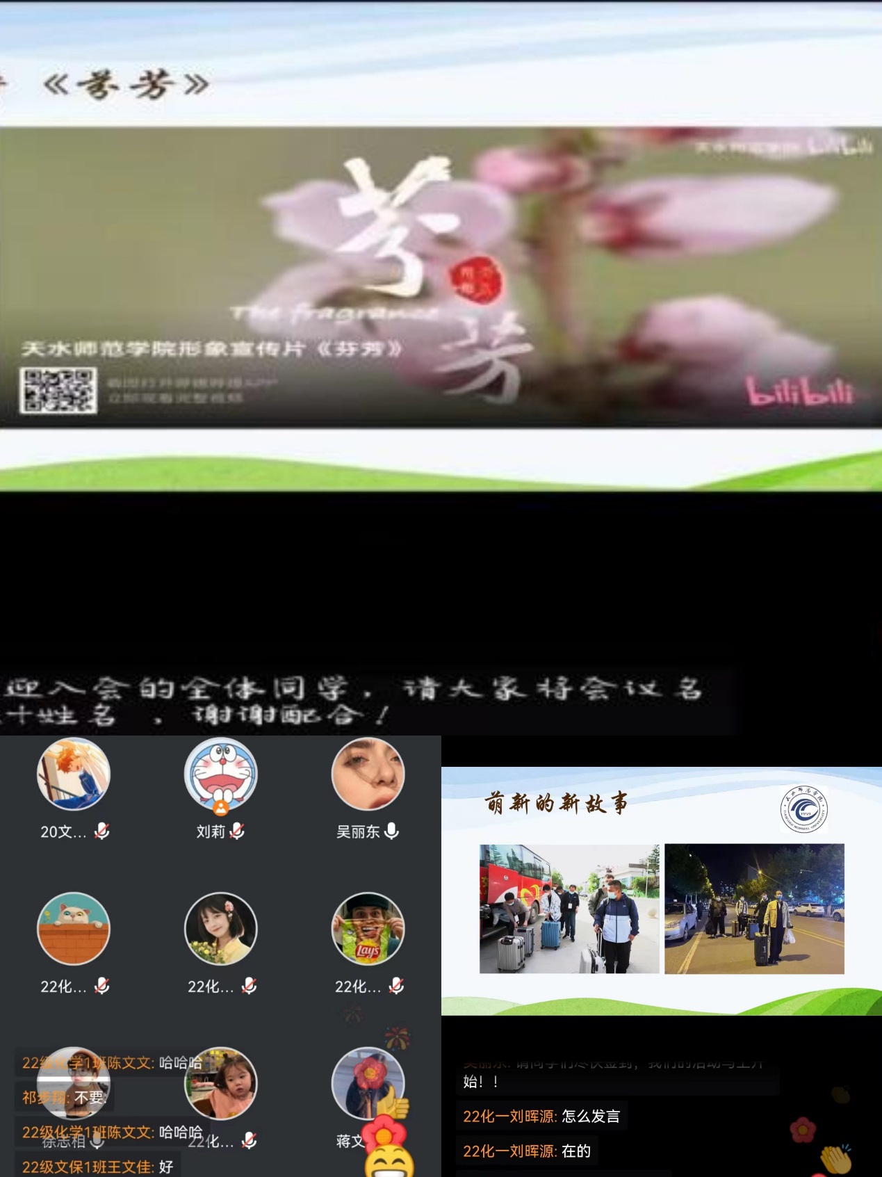 座谈会上,首先为2022级新生播放了我校宣传片《芬芳》,视频中向大家展示了羲皇故里,丝路明珠,龙城天水。随后,20级和22级学生干部带领新生共同合唱了天水师范学院校歌《我的精神家园》。最后,20级与21级学生代表分别发言,给大家分享了她们精彩的团故事,畅谈了在学校学习生活的感受,并为新生解决了他们生活与学习中遇到的问题。