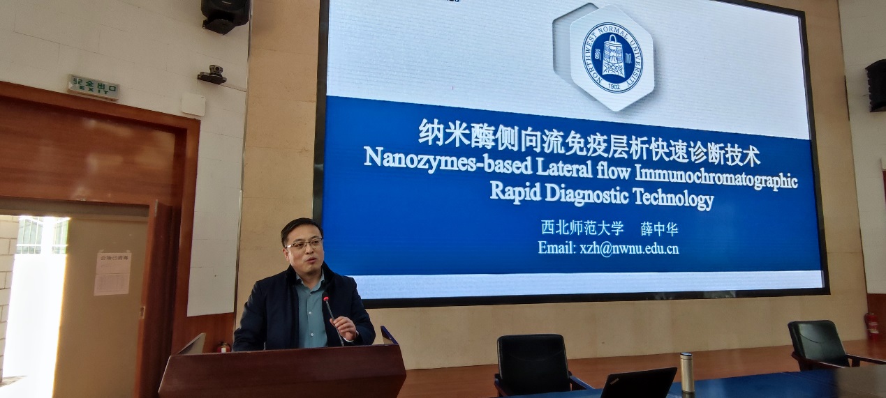 2月28日,应科研管理处和太阳成集团tyc7111cc主页邀请,西北师范大学化学化工学院院长薛中华教授为学院师生作题为《纳米酶侧向流免疫层析即时检测》的学术报告。学院教师、研究生及200余名本科生聆听了报告。