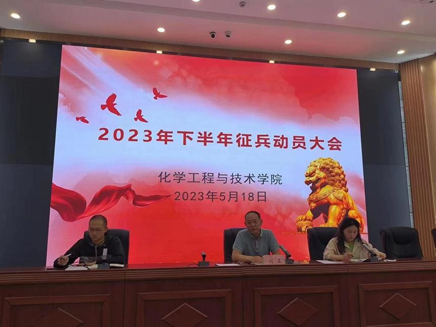 5月18日下午,化工学院在四号报告厅举行了2023年下半年征兵工作动员大会。学院副书记刘正、各班班主任、全体辅导员、在校男同学共计200余人参加会议。