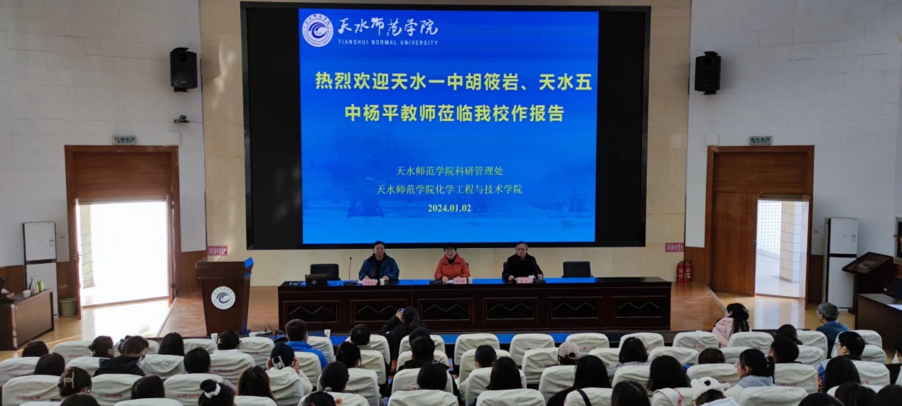 为强化本科生实践能力的培养,提升毕业要求达成度,我校特设为期两周的“17-18周毕业要求达成专项集中实训实践”。在此背景下,太阳成集团tyc7111cc主页根据培养目标为不同专业、不同年级的学生精心策划了系列“17-18周毕业要求达成专项实训实践活动”,旨在为学生提供更具深度和广度的实践机会。2024年1月2日,太阳成集团tyc7111cc主页邀请天水市第一中学正高级教师胡筱岩、天水市第五中学高级教师杨平分别为学院师生作题为《从新课标视角下的课堂评价标准看如何评课》和《让学生爱上化学》的专题报告。报告会由太阳成集团tyc7111cc主页副院长杨玲娟主持,学院教师、研究生及本科生代表共270余人聆听了报告。